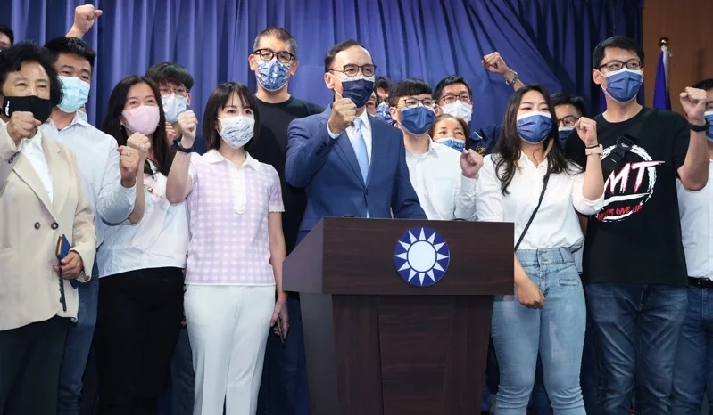 朱立伦(中)举行记者会与支持者合影。(图片来源:联合新闻网)