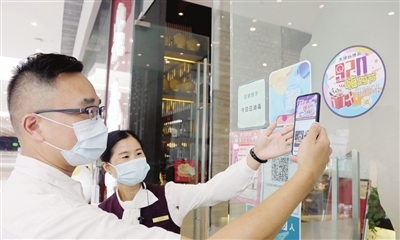 消费者在售卖台湾美食和商品的实体店铺扫码“920嗨购节”享受打折优惠。 本报记者 王倩 摄