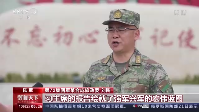 第72集团军某合成旅政委刘陶:习主席的报告绘就了强军兴军的宏伟蓝图,让我们心潮澎湃、深受鼓舞。作为一线作战部队,我们一定坚定扛起备战打仗的神圣职责,奋力锻造能战善战的精兵劲旅。
