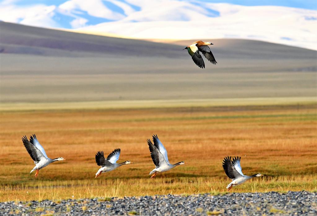 一只赤麻鸭(上)和一群斑头雁在保护区尼玛县那若塘湿地上飞翔。新华社记者张汝锋 摄