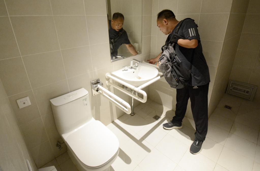 2021年7月15日,无障碍专家在北京延庆赛区冬奥村检查室内卫生间无障碍设施。新华社记者 李欣 摄