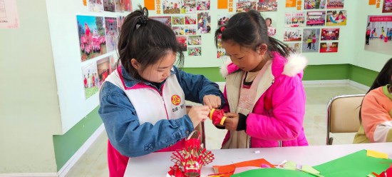 云南会泽新城妇联项目点的志愿者正教授孩子做手工艺品。(受访者供图)