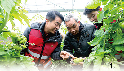 图①:广西壮族自治区融安县大良镇古兰村,驻村第一书记(左)给农户讲解番茄管护知识。