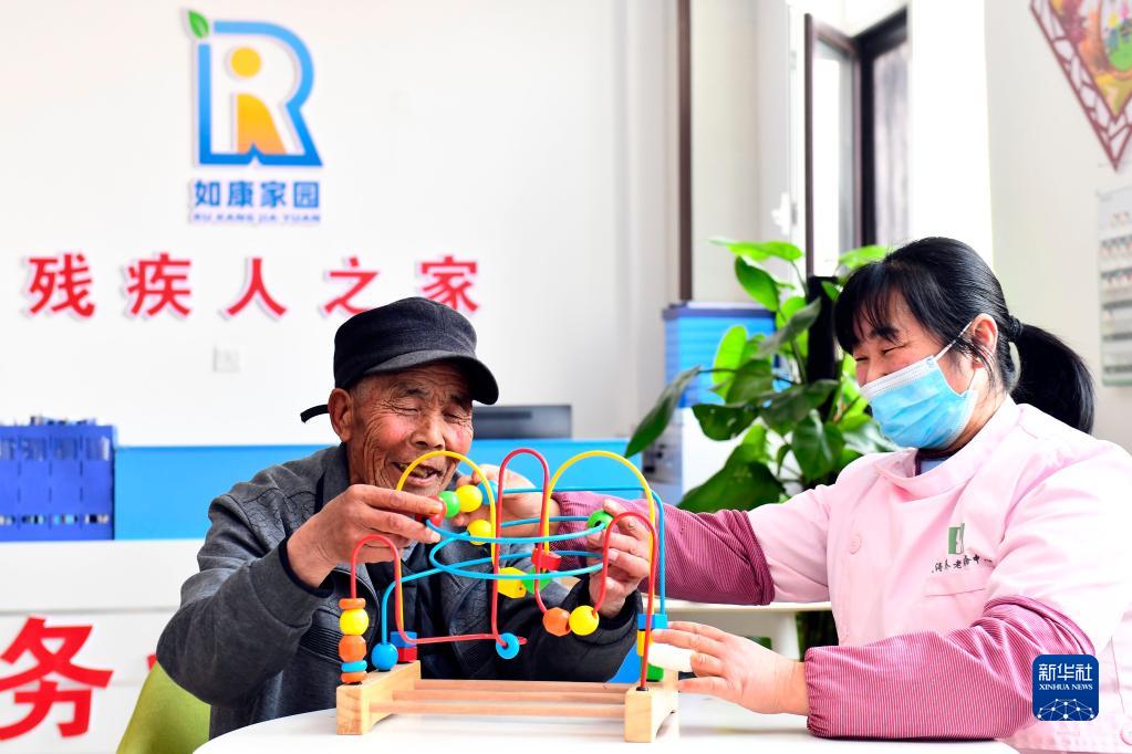 3月1日,在日照市岚山区黄墩镇“如康家园”残疾人之家,工作人员陪护老人进行益智锻炼。