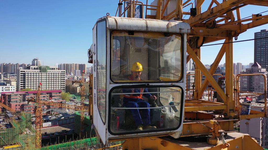 吉克达富正在观察班组内的塔式起重机。新华社记者李紫薇 摄(2022年3月21日)