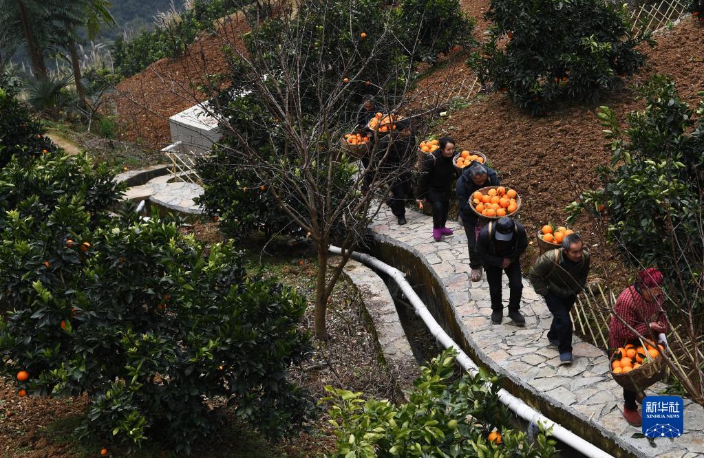 毛相林(右二)和下庄村村民在背运刚采摘的柑橘(2021年1月7日摄)。新华社记者 王全超 摄