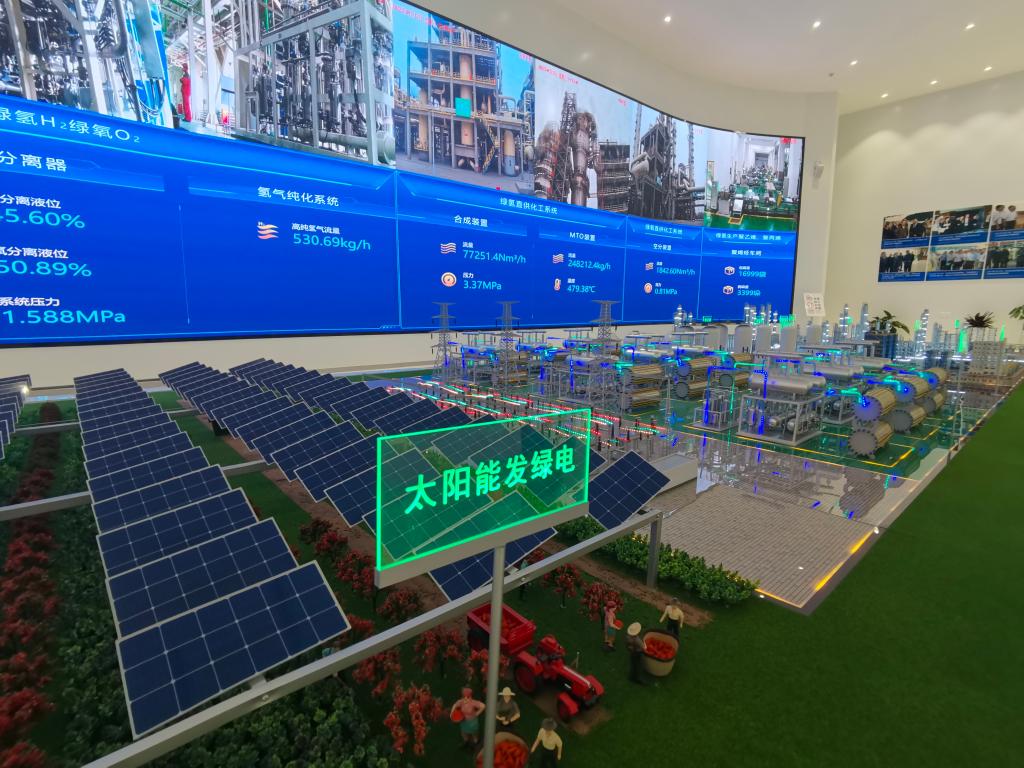 这是宁夏宝丰能源集团在探索用煤替代油气生产高端化工产品后,启动的太阳能电解水制氢项目,以寻找煤的替代品。据了解,这个项目通过“风光互补”发“绿电”制取绿氢、绿氧,直供化工生产装置,从而实现节能减污降碳。