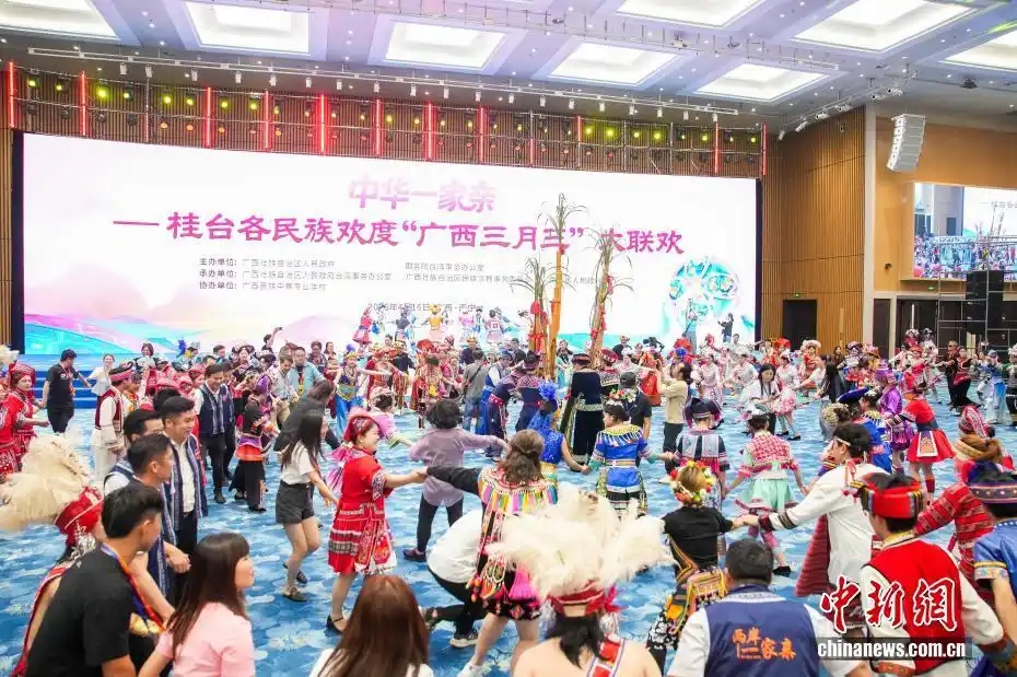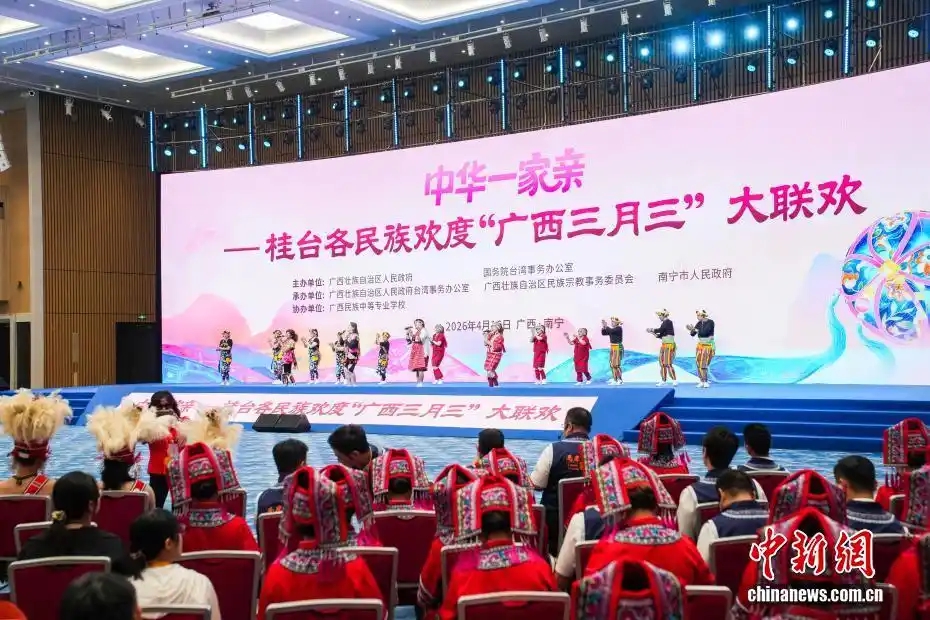 4月16日,中华一家亲——2026桂台各民族欢度“广西三月三”大联欢活动在广西南宁举行。本次活动由国务院台湾事务办公室和广西壮族自治区人民政府共同主办,500余名桂台两地同胞跨越山海,齐聚一堂,共叙两岸亲情,共话交流合作。图为活动现场。中新社记者 陈冠言 摄