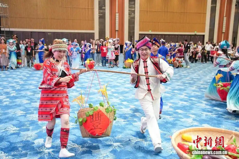 4月16日,中华一家亲——2026桂台各民族欢度“广西三月三”大联欢活动在广西南宁举行。本次活动由国务院台湾事务办公室和广西壮族自治区人民政府共同主办,500余名桂台两地同胞跨越山海,齐聚一堂,共叙两岸亲情,共话交流合作。图为桂台两地同胞共同参与互动活动“把丰收带回家(挑扁担)”。中新社记者 陈冠言 摄