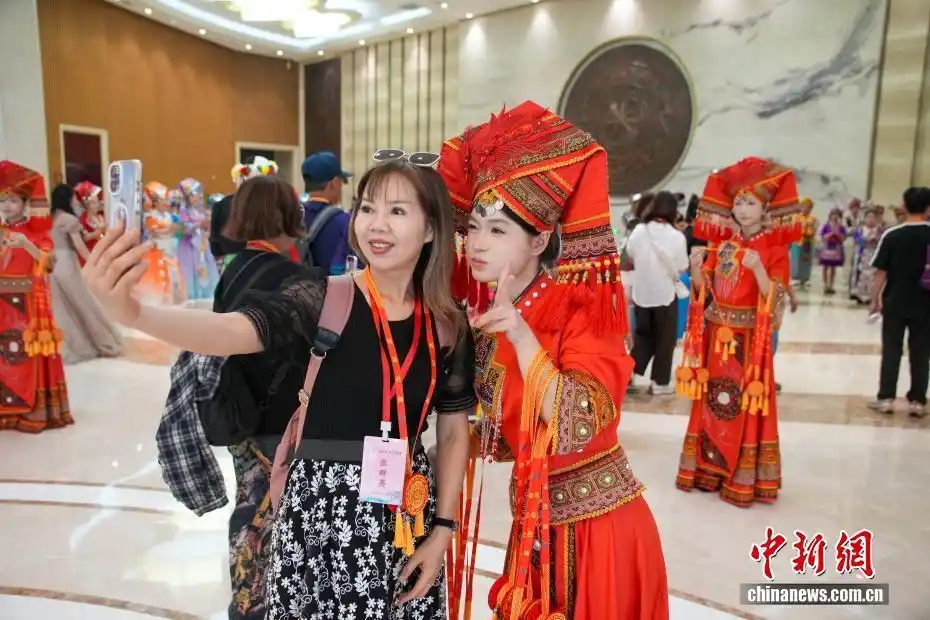 4月16日,中华一家亲——2026桂台各民族欢度“广西三月三”大联欢活动在广西南宁举行。本次活动由国务院台湾事务办公室和广西壮族自治区人民政府共同主办,500余名桂台两地同胞跨越山海,齐聚一堂,共叙两岸亲情,共话交流合作。图为桂台两地同胞在活动现场自拍。中新社记者 陈冠言 摄