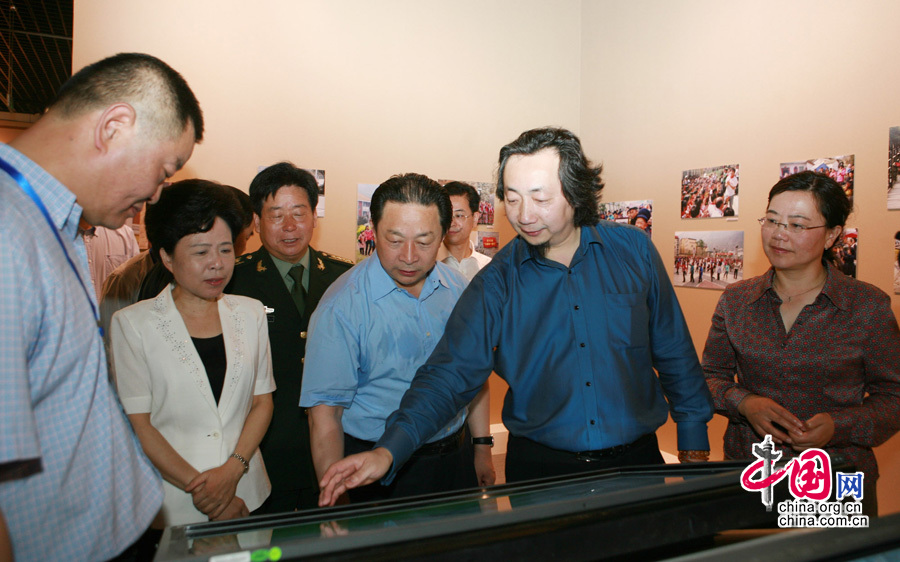 2011年5月9日上午,“瞬间永恒——5 12汶川特大地震三周年大型纪实摄影展”在四川博物院隆重举办。图为摄影展策展人孟繁佳(右一)为与会嘉宾讲解影展中的新装置。(人民画报 吴亮 摄影)