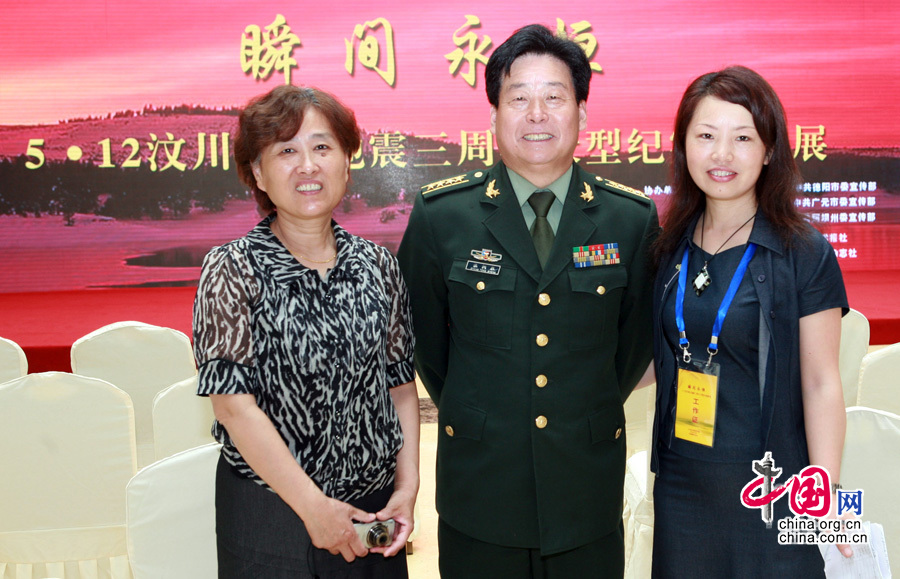 2011年5月9日上午,“瞬间永恒——5 12汶川特大地震三周年大型纪实摄影展”在四川博物院隆重举办。图为中国网副总编辑张梅芝(左)与中国摄影家协会副主席张桐胜(中)在影展开幕式现场合影留念。(人民画报 吴亮 摄影)