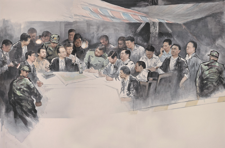 公元2008年5月12日14时28分,四川汶川突发八级大地震,距震中仅十余公里的都江堰市公安局临危不乱,迅速在门外人行道上成立临时指挥点,组织干警应对突发情况。在随后的数小时内,都江堰市、成都市、四川省的党政领导及有关部门也先后来到此处指挥抢险救人。20时许,遵照胡锦涛总书记“尽快抢救伤员、确保灾区人民群众生命安全”的重要指示,中共中央政治局常委、国务院总理温家宝赶到都江堰市,了解灾情并在此处冒着风雨余震连夜召开了国务院抗震救灾指挥部第一次会议。全力抢救灾民生命的决策在此做出,全国万众一心抗震救灾的局面由此形成。时值汶川地震三周年,中国共产党九十华诞,特作画纪念之。