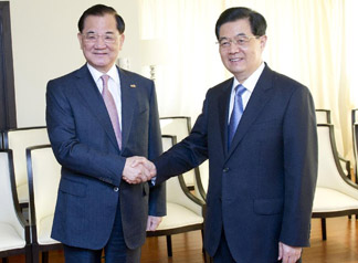 | 中共中央总书记胡锦涛当地时间9月7日上午在俄罗斯符拉迪沃斯托克会见了中国国民党荣誉主席连战。胡锦涛强调国共两党领导人2005年共同发布的“两岸和平发展共同愿景”提出的主张,大多都已得到实现。两党选择的两岸关系和平发展道路,方向是正确的,前景是光明的。两党和两岸双方应该沿着这条道路继续向前迈进,不断... |