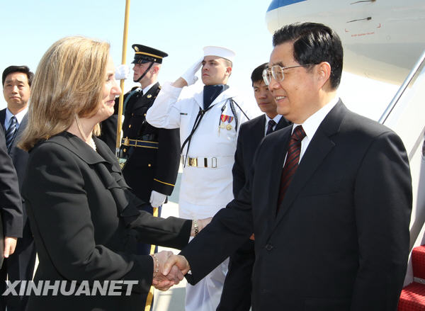 当地时间12日11时,胡锦涛主席乘坐的专机抵达华盛顿安德鲁斯空军基地。停机坪上,美方官员和中国驻美大使等热情迎候。11时03分,胡锦涛主席走下舷梯,同美方官员和中国驻美大使等一一握手,随后乘车离开机场,整个过程仅持续了5分钟。