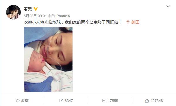 6月28日,演员秦昊在微博中贴出一张妻子伊能静与刚出生的女儿的合照,宣告家中迎来了新成员,“欢迎小米粒光临地球,我们家的两个公主终于同框啦!”,而刚刚顺利产女的伊能静也转发微博并自称是“哭得比小米粒皱的傻妈”。