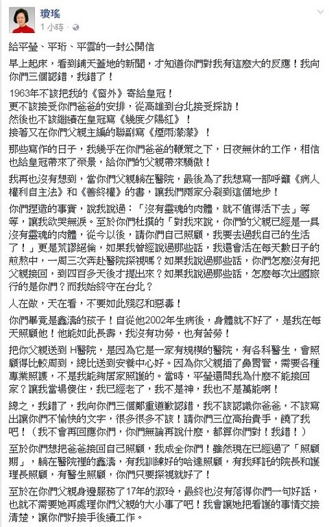 5月2日晚间,琼瑶发文向3名继子女道歉,同时反指对方捏造事实,并说暂时不会去探视丈夫,“我现在万念俱灰,也不再相信人间有情”;5月6日晚间,她又突然在脸谱网上发长文与粉丝道别,宣布自己即将关闭脸书,“这次是‘珍重再见,后会无期’了!”;8月1日,琼瑶无视继子女的不满和公开讽刺,为以记录她与第二任丈夫“老夫老妻”生活的新书《雪花飘落之前:我生命中最后的一课》公开露面,自曝曾与老公“相约去死”的秘密约定。