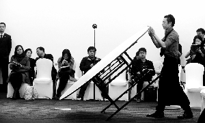 另外,一款“红与黑”的特色餐台也很打眼。中式餐台的颜色一般是黄、白、红为主,红黑搭配让人感觉耳目一新。昨天的展示现场,桌布和椅布都是黑色,椅子上再配有红色布带。每位用餐者的菜单都是用黑色卡片纸卷起来,并配上红色的羽毛,很是时尚。