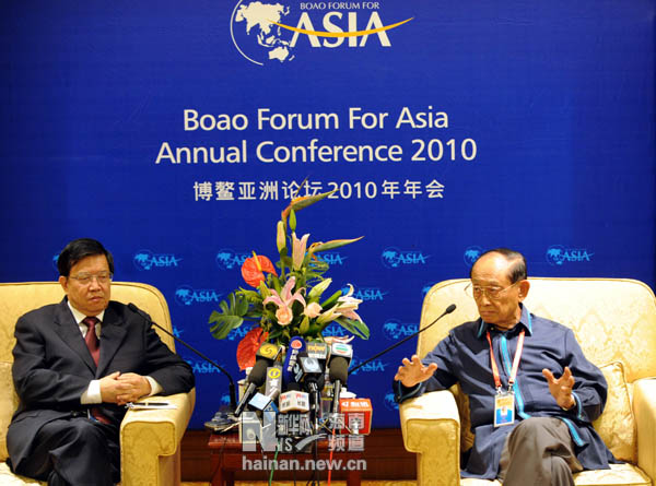 4月11日,博鳌亚洲论坛在海南博鳌举行新闻发布会。这是即将卸任的博鳌亚洲论坛理事长、菲律宾前总统拉莫斯(右)在回答记者提问。新华社记者赵颖全摄