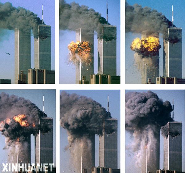 2001年9月11日,恐怖分子劫持了美国4架民航客机,其中两架撞坍了纽约世贸中心“双子大厦”,一架撞毁华盛顿五角大楼的一角,另一架坠毁。这一系列袭击导致3000多人死亡,并造成数千亿美元的直接和间接经济损失。这是一架飞机撞击纽约世贸中心“双子大厦”南楼的拼版照片(2001年9月11日摄)。新华社发