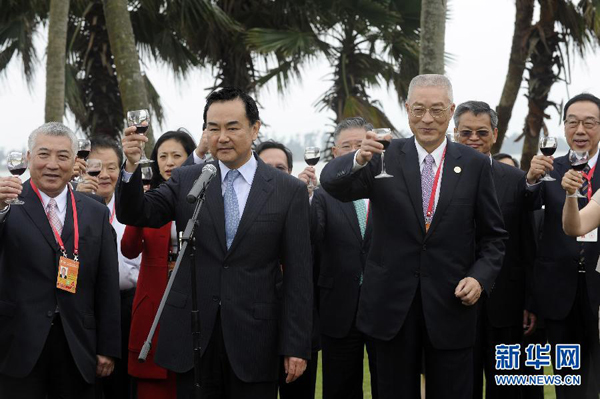 4月1日,中共中央台办、国务院台办主任王毅在海南博鳌举行招待酒会,欢迎前来出席博鳌亚洲论坛的台湾两岸共同市场基金会名誉团长吴敦义一行。新华社记者金良快摄