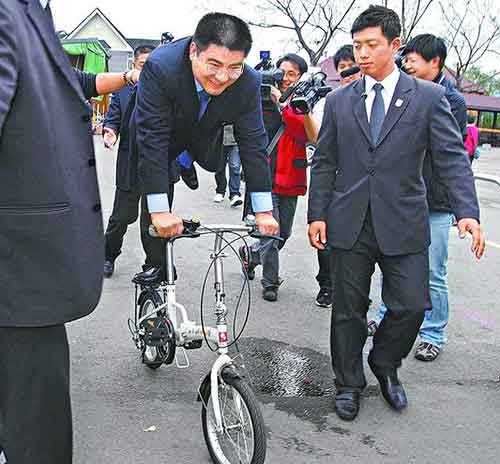 陈光标一行人昨到竹山紫南宫拜拜,还一时技痒跟民众借脚踏车耍特技。图片来自网络