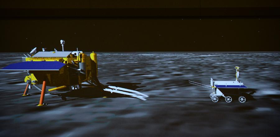 这是在北京飞控中心大屏幕上拍摄到“嫦娥三号”着陆器巡视器成功分离的模拟画面。 12月15日4时35分,“嫦娥三号”着陆器巡视器成功分离。 新华社记者 李鑫 摄