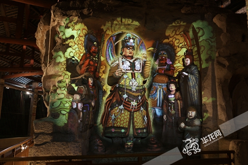 与白昼的神圣静穆完全不同,夜晚的北山石刻灯光绚烂,仿佛进入一个如梦似幻的佛国境地。光影系统新增了动态影像,让石窟造像重现出自唐末宋初以来建造时富丽堂皇的迷人风采。这一切都得益于由半虚拟现实技术支撑的夜游系统的开放。