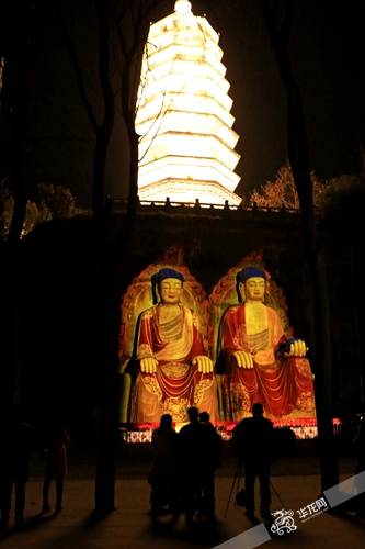 重庆市大足区大足石刻北山景区,多宝塔和二佛以全新动感绚丽的形象出现在夜空中,这是正在打造的北山石刻夜游系统工程进行局部试运行所呈现的效果。大足石刻旅开委供图(首席记者 雷其霖 实习生 陈静文)