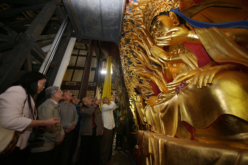 2015年5月5日,重庆市大足区宝顶山千手观音造像抢救性保护工程现场,专家正对工程修复质量、效果等进行查验。