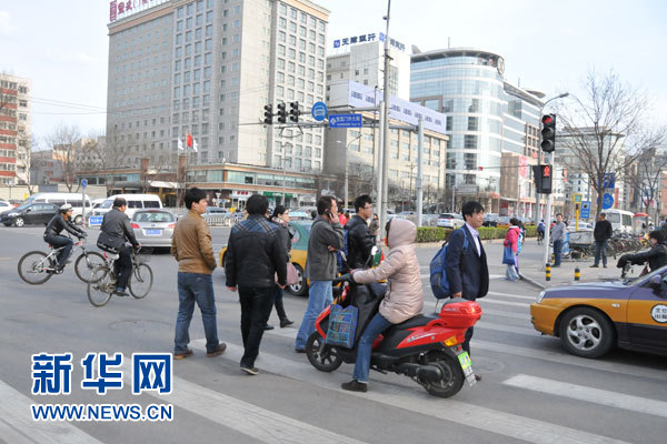 4月9日下午,在宣武门路口,红灯亮起,几位行人却执意进行“中国式过马路”。新华网记者 陶叶摄