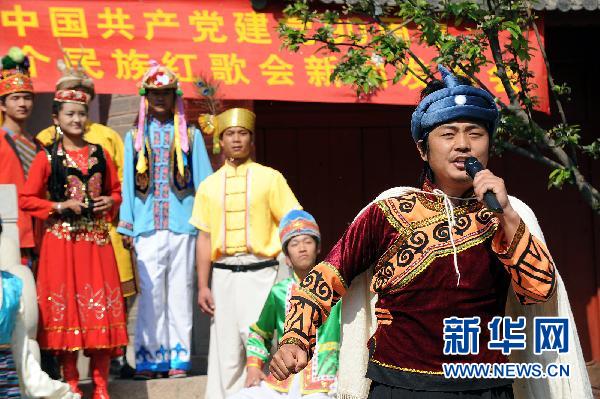 4月22日,中华民族园少数民族原生态艺术团演员在首期红歌会上唱红歌。为迎接中国共产党建党九十周年,北京市爱国主义教育基地、民族团结教育基地——中华民族园,于2011年4月至7月开展“‘唱支山歌给党听’56个民族唱红歌”主题活动。在中华民族园工作的各民族同胞唱响红歌。新华社记者张旭摄