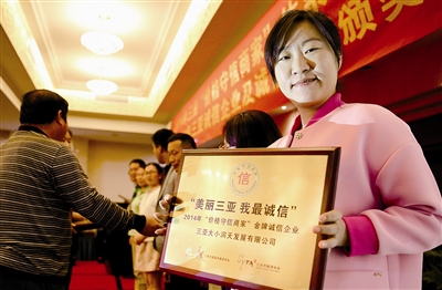 12月18日下午,三亚“价格守信商家”体系建设总结大会暨2014年三亚诚信人物及企业颁奖典礼在三亚湘投银泰度假酒店召开,大会对三亚50家诚信金牌商家、13位优秀诚信人物授予先进牌匾和奖杯。副市长吴鹏为获奖单位和个人颁奖。。