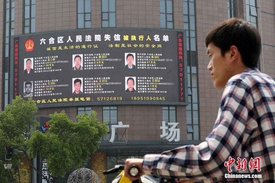 4月14日,街头的大屏幕滚动播放着“老赖”相关信息。从当日起,南京六合法院在该区最繁华的地段楼宇最大的LED显示屏滚动播放第一批27名失信被执行人名单,公布的信息包括照片、姓名、身份证号码、执行标的、执行依据案号等。据介绍,这27名被执行人涉及的案件有民间借贷纠纷、借款合同纠纷、劳务合同纠纷、买卖合同纠纷、道路交通事故赔偿等,执行标的从1.5万到2500万元。中新社发 泱波 摄
