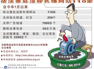 | 记者20日从国家互联网信息办公室获悉:国信办全力开展“扫黄打非·净网2014”专项行动,目前已依法查处淫秽色情网站110家,关闭各类违法违规账号3300多个,专项行动取得初步成效。 |
