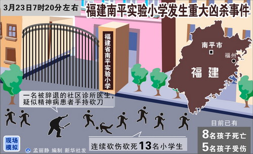 3月23日7时20分左右,正逢孩子上学的时间,福建省南平市实验小学门口,一名中年男子手持砍刀,连续砍伤砍死13名小学生,截至记者发稿时已有8名孩子死亡,5名孩子受伤。受伤孩子目前正在南平中医院和市立医院全力抢救。目前案件调查、审理和善后工作正在进行中。