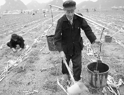 3月22日,广西天等县荣华村农民给采用免耕、秸秆覆盖等节水技术种植的春玉米苗施肥。 湘泉摄(新华社发)