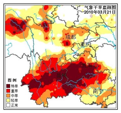 中央气象台21日18时继续发布干旱黄色预警:根据3月21日监测,云南大部、贵州中部和西南部、川西高原南部和广西西北部等地维持气象干旱重旱等级。