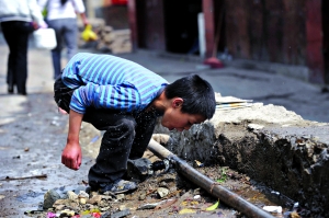 昨日,云南省曲靖市罗平县老厂乡一名儿童,喝着从运输水源管道缝隙中流出的水。记者 李强 摄