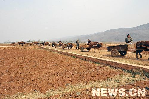 3月23日,云南省宣威市热水镇营沟村的村民赶着牛车到村里的水源点取水。新华社 记者 何俊昌摄