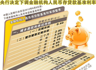 | 中国人民银行决定,自2012年6月8日起金融机构一年期存款基准利率和一年期贷款基准利率均下调0.25个百分点,其他各档次存贷款基准利率及个人住房公积金存贷款利率相应调整。 |