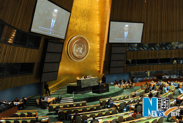 会议在联大会议厅举行,联合国秘书长潘基文和会员国常驻联合国的代表出席会议。