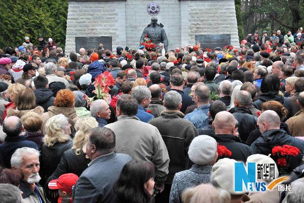 5月9日,在爱沙尼亚首都塔林,人们排队向苏军解放塔林纪念碑献花。当天,爱沙尼亚举行各种活动,庆祝世界反法西斯战争胜利65周年。新华社发(维克托摄)