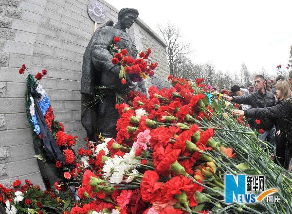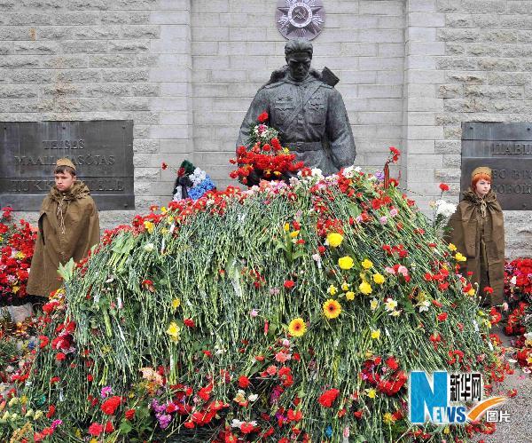 5月9日,在爱沙尼亚首都塔林,苏军解放塔林纪念碑前堆满了献花。当天,爱沙尼亚举行各种活动,庆祝世界反法西斯战争胜利65周年。新华社发(维克托摄)