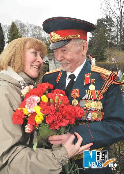 5月9日,在爱沙尼亚首都塔林,一名参加二战的老战士接受人们的祝福。当天,爱沙尼亚举行各种活动,庆祝世界反法西斯战争胜利65周年。新华社发(维克托摄)