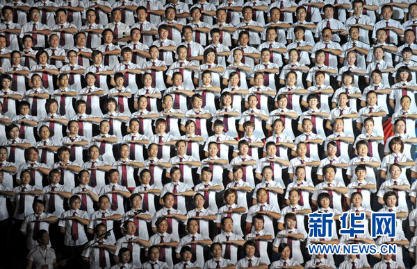 7月30日,宁夏邮政公司代表队在演唱歌曲《游击队之歌》。当日,宁夏银川举行庆祝建军83周年“军旗正红”红色歌曲演唱会。解放军、武警官兵及各单位11支代表队的6000多人同唱红歌,迎接“八一”建军节。新华社记者 王鹏 摄