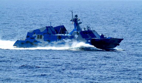 7月26日,参加演练的新型导弹快艇高速驶向发射阵位。新华社记者 查春明 摄