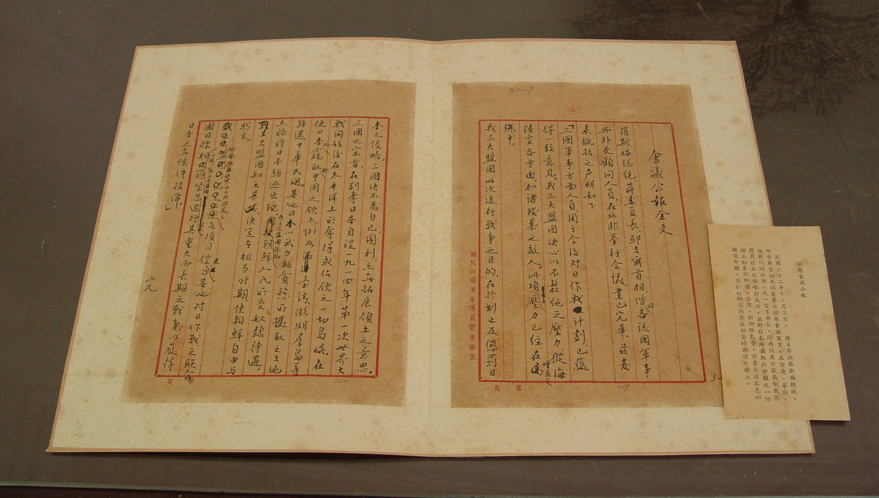 1943年11月22日至26日,中、美、英三国首脑聚首米纳豪斯饭店,讨论如何协调对日本作战的共同军事问题以及战后如何处置日本等政治问题,并通过了《开罗宣言》。《开罗宣言》明文规定,“日本所窃取于中国之领土,例如东北四省、台湾、澎湖群岛等,归还中华民国。其他日本以武力或贪欲所攫取之土地,亦务将日本驱逐出境”。