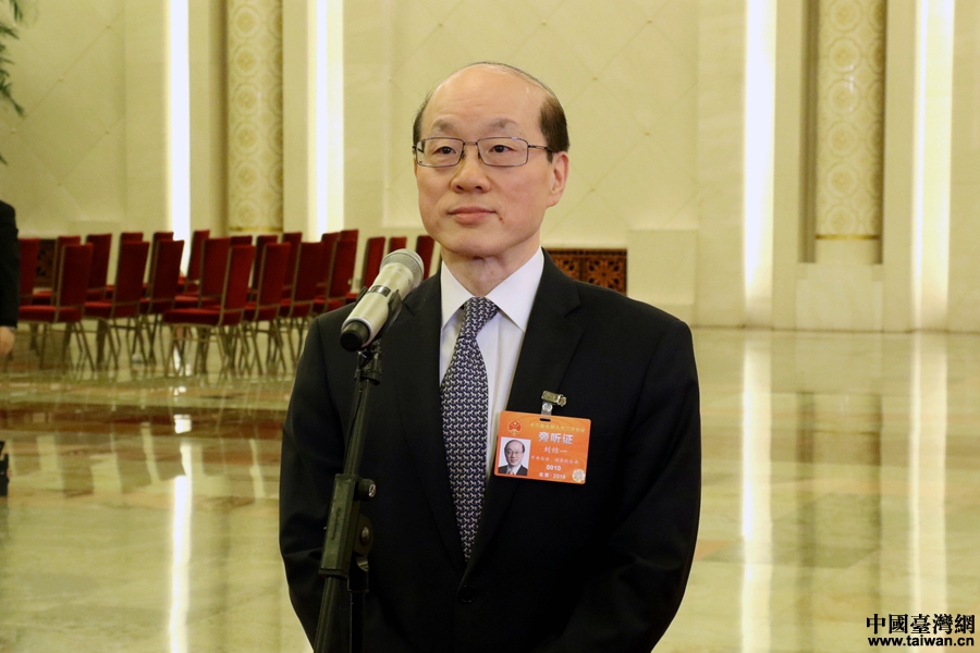 中共中央台办、国务院台办主任刘结一在“部长通道”接受采访。(中国台湾网 尹赛楠 摄)