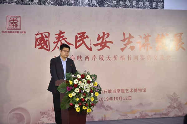 “国泰民安 共谋发展”2019海峡两岸敬天祈福书画鉴赏交流会在中国·泰山石敢当摩崖艺术博物馆拉开帷幕。(中国台湾网 发)